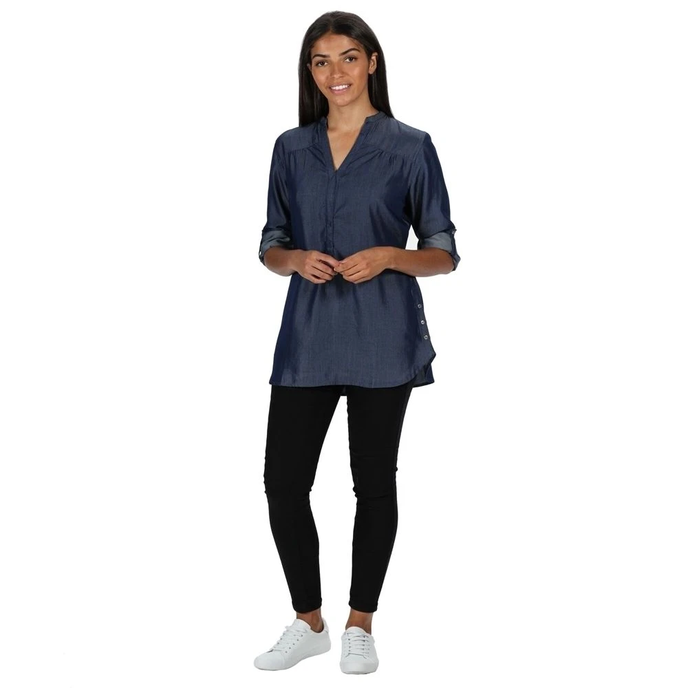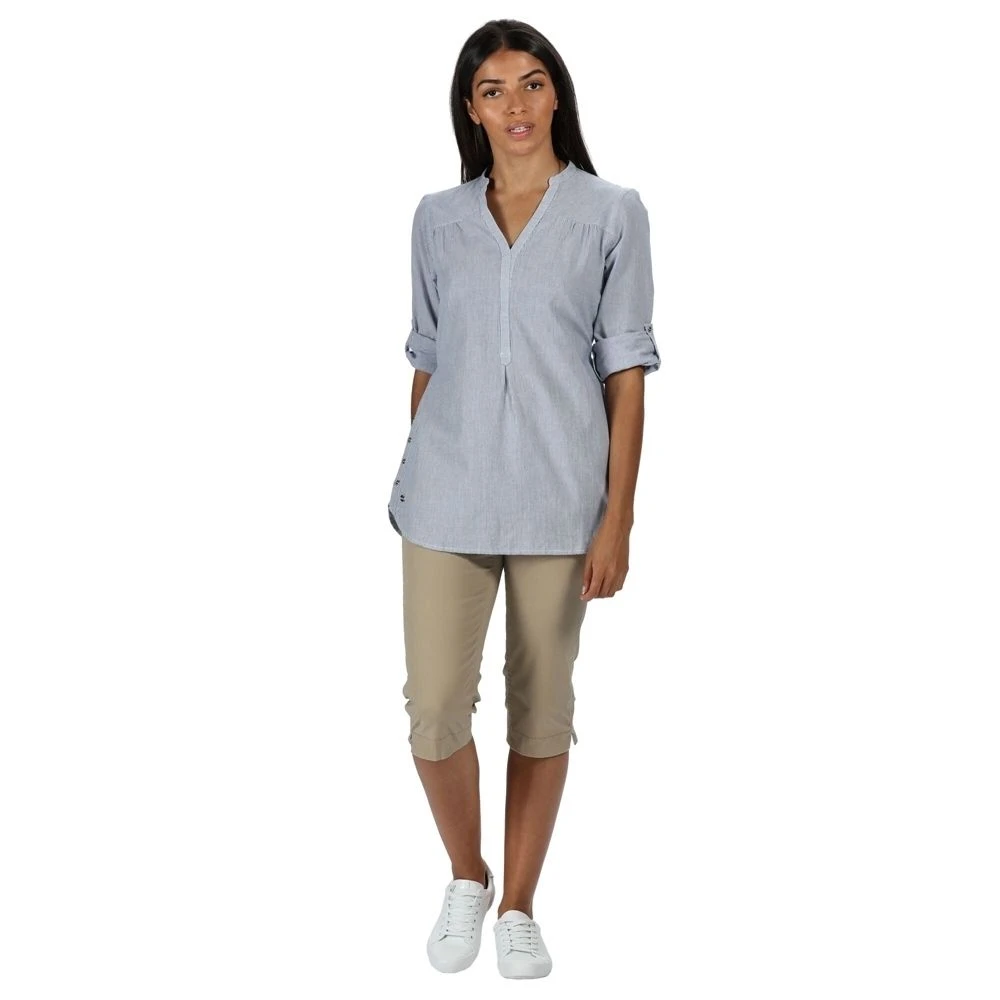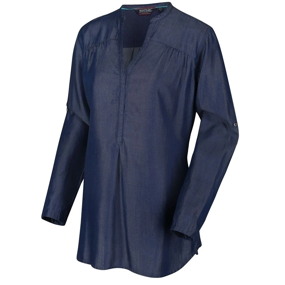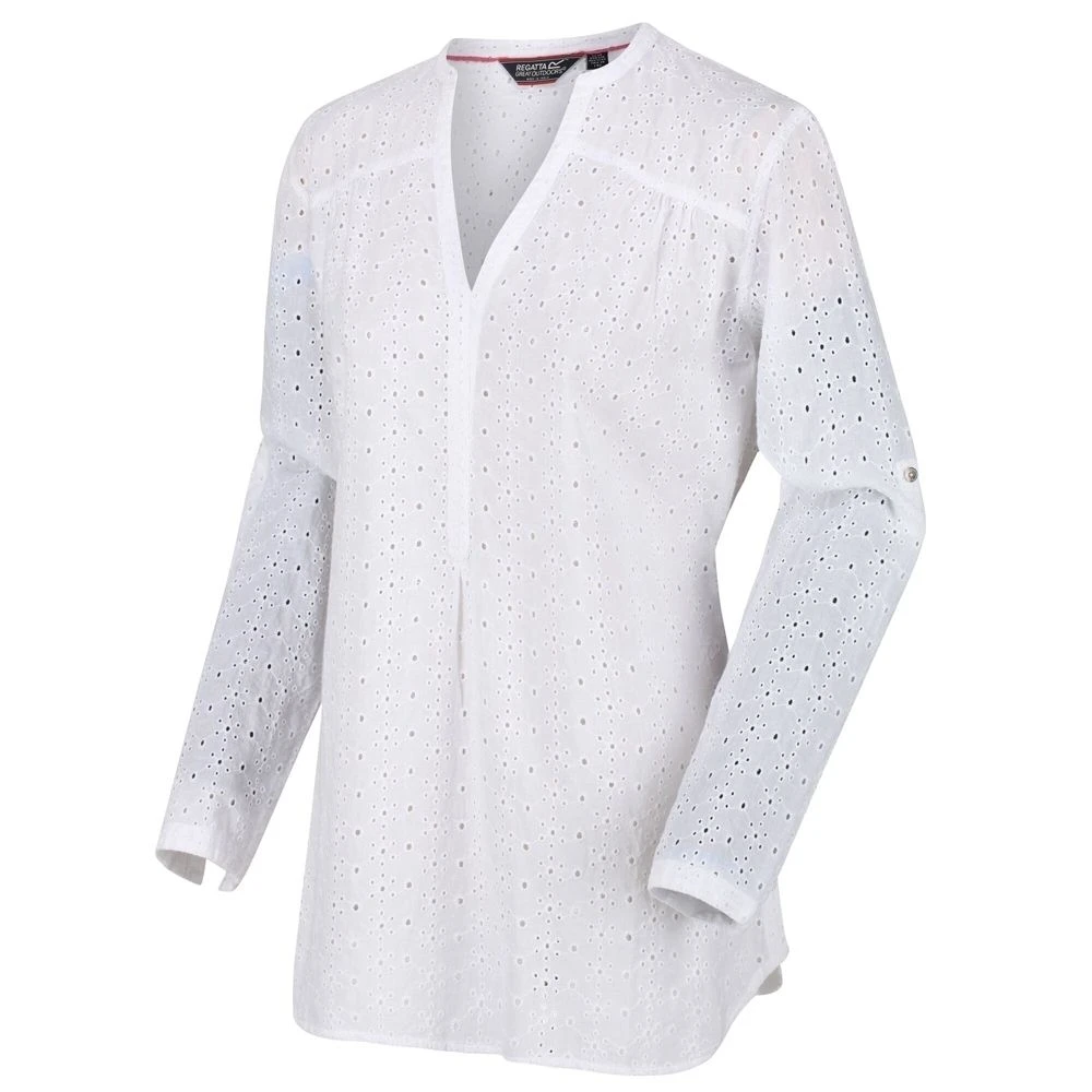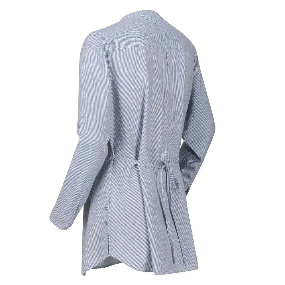 Keep your casual look upgraded with this Regatta Womens Mealie Coolweave Long Sleeve Shirt. The shirt is the final product of 100% cotton and coolweave fabric that is known for its cooling properties and breathability. It comes with turn-up cuffs with button fastening, so you can style it your way. There’s also a tie belt at the waist for an enhanced overall look.