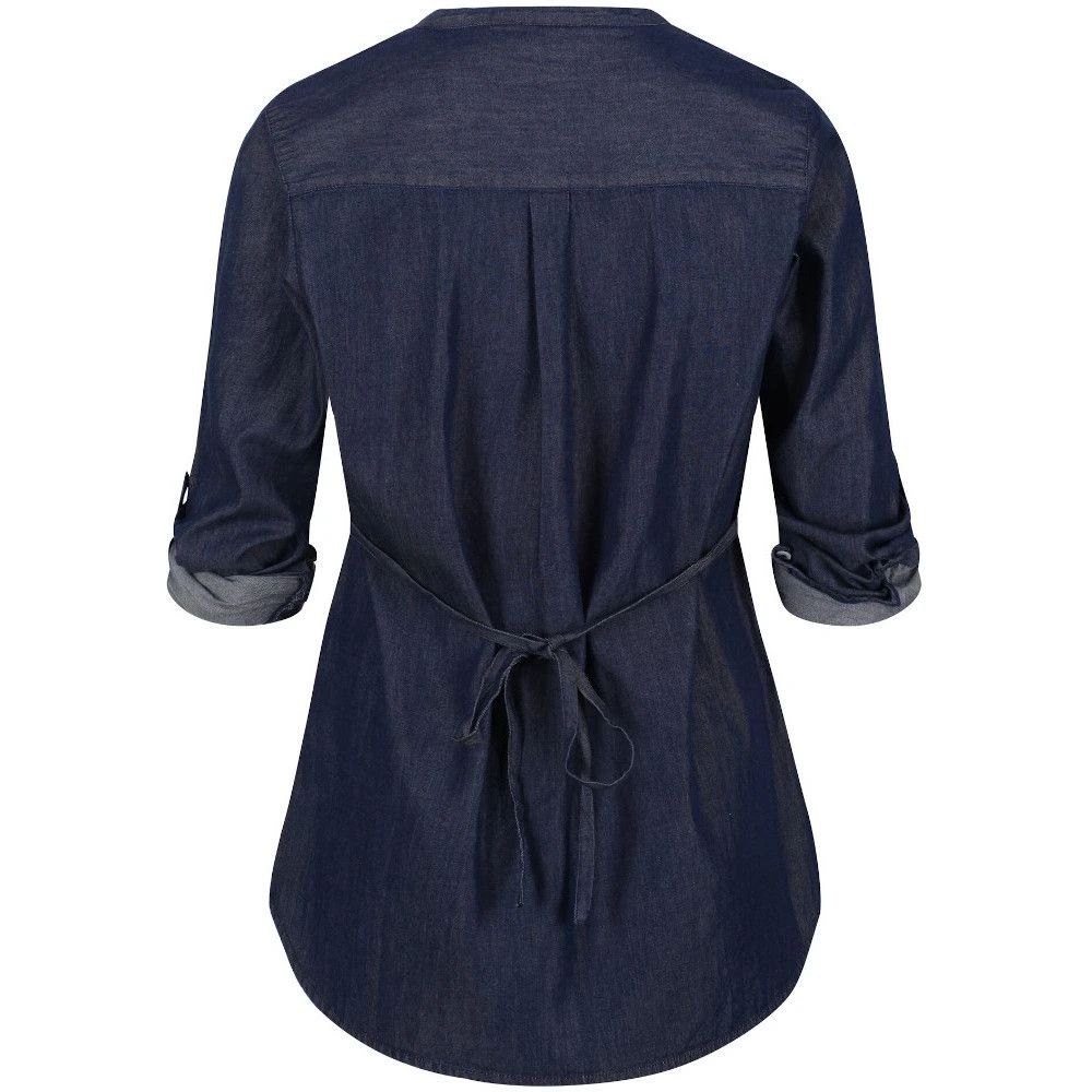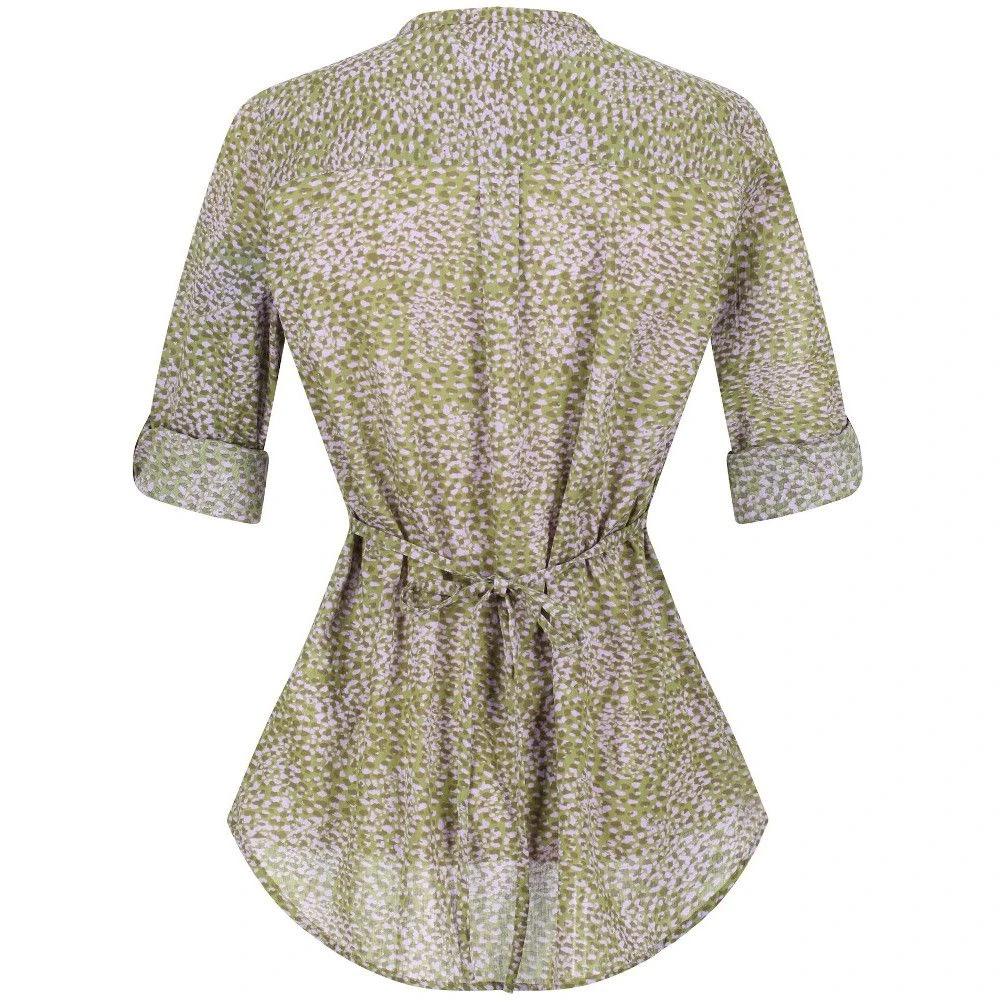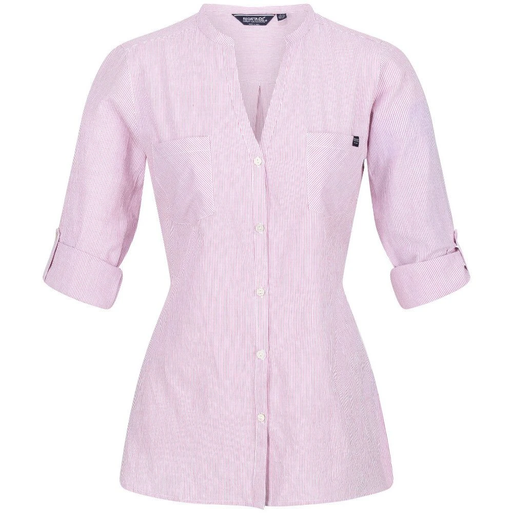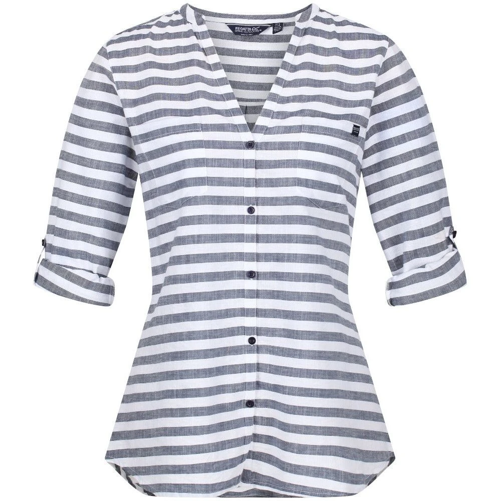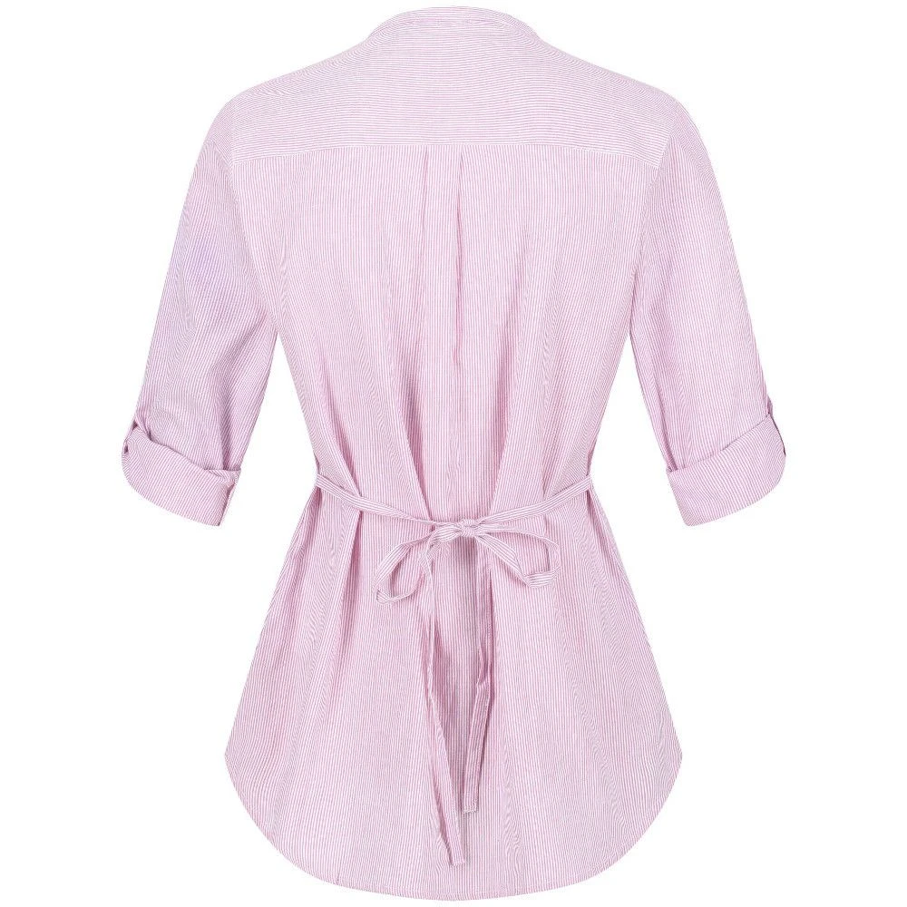 The Regatta Malaya Shirt looks stylish with its all-over horizontal striped design. Made from Coolweave sustainable cotton and lurex metallic fine stripe fabric, the shirt offers all-day comfort and style. It features a V-neckline and long sleeves with roll tabs and button fastening. The two chest patch pockets offer adequate stash storage space, a waist tie belt, and the shirttail hem offers enhanced style and added coverage. The four-button placket on the front offers ease in wearing and removing the shirt.